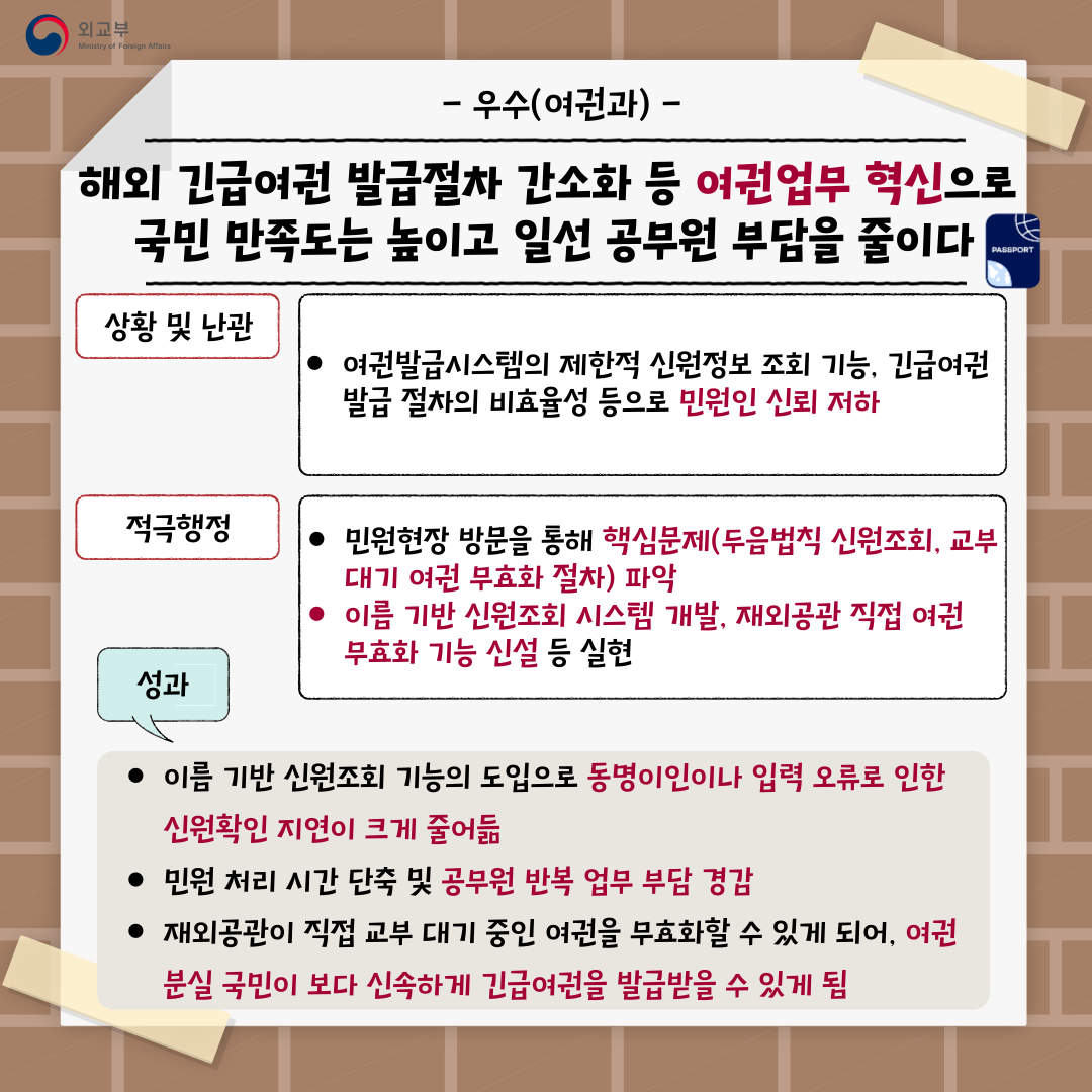 2025년 제1차 외교부 적극행정 우수사례 공모전을 통해 선발된 우수사례 8건을 소개합니다.